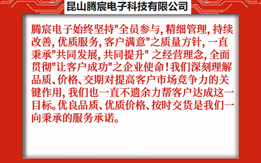 昆山騰宸電子科技有限公司位于中國線路板加工之都昆山千燈,公司專注于電路板研發(fā)設計、PCB抄板、元器件采購、SMT貼片加工、組裝測試,為客戶提供一站式電子制造服務。騰宸電子始終堅持"全員參與,精細管理,持續(xù)改善,優(yōu)質服務,客戶滿意"之質量方針,一直秉承"共同發(fā)展,共同提升" 之經營理念,全面貫徹"讓客戶成功"之企業使命!我們深刻理解品質、價格、交期對提高客戶市場競爭力的關鍵作用,我們也一直不遺余力幫客戶達成這一目標。優(yōu)良品質、優(yōu)質價格、按時交貨是我們一向秉承的服務承諾。 ...
